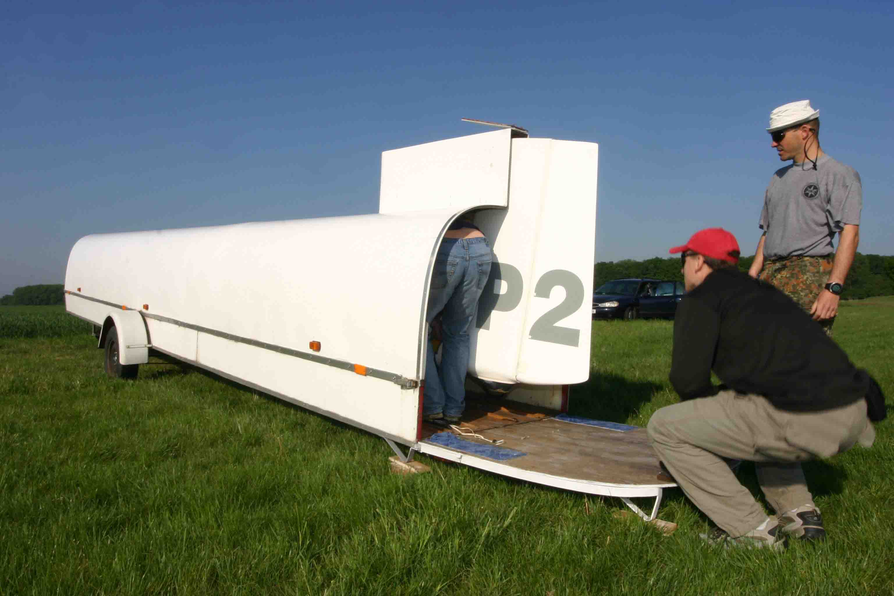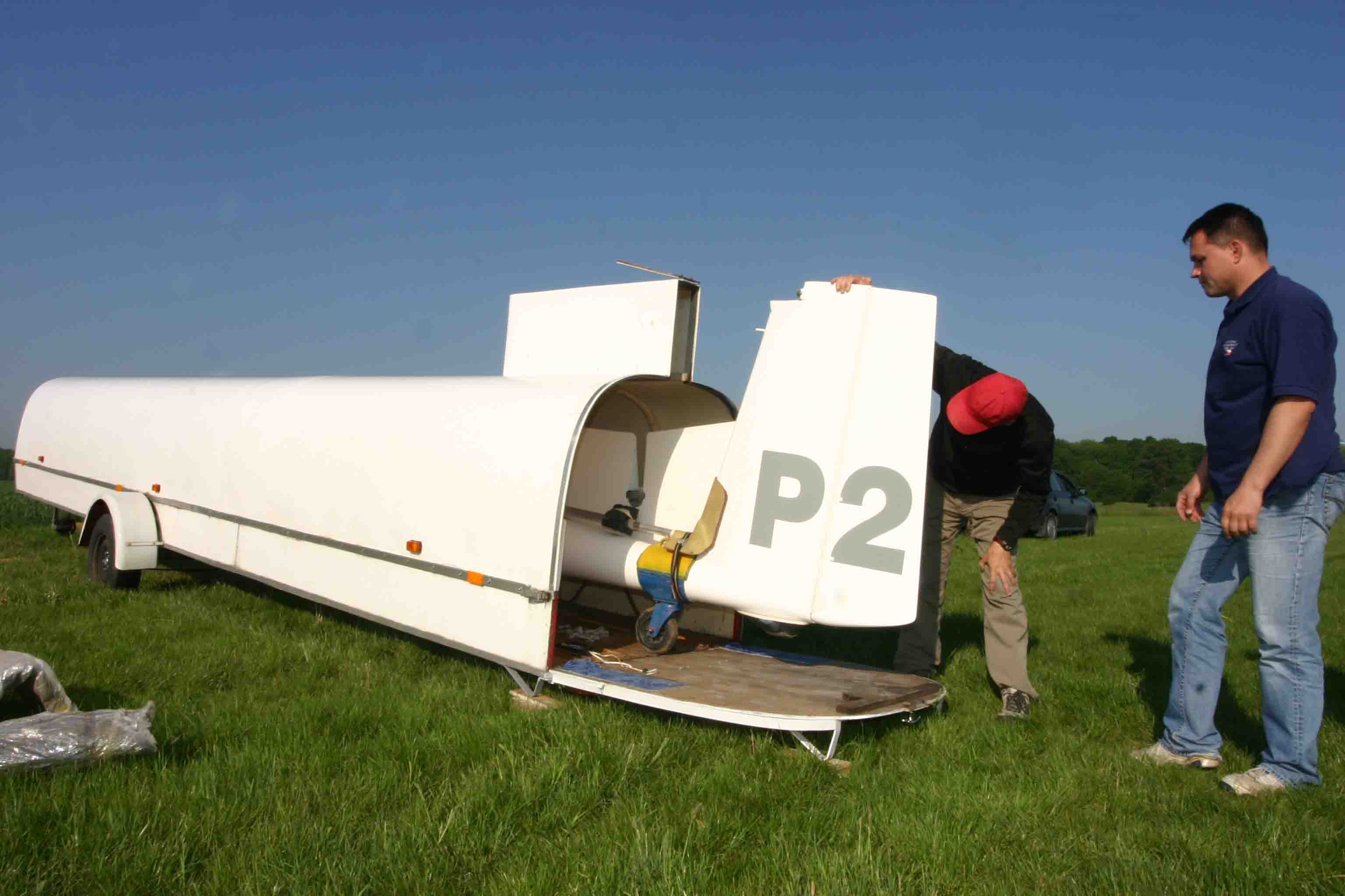 Nezasvěcený by jen těžko tušil, že se toto letadlo vešlo do v pozadí stojícího přívěsného vozíku…