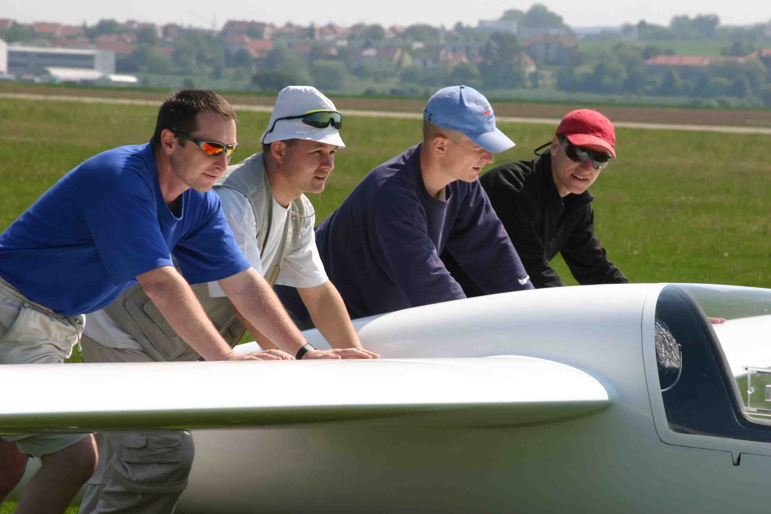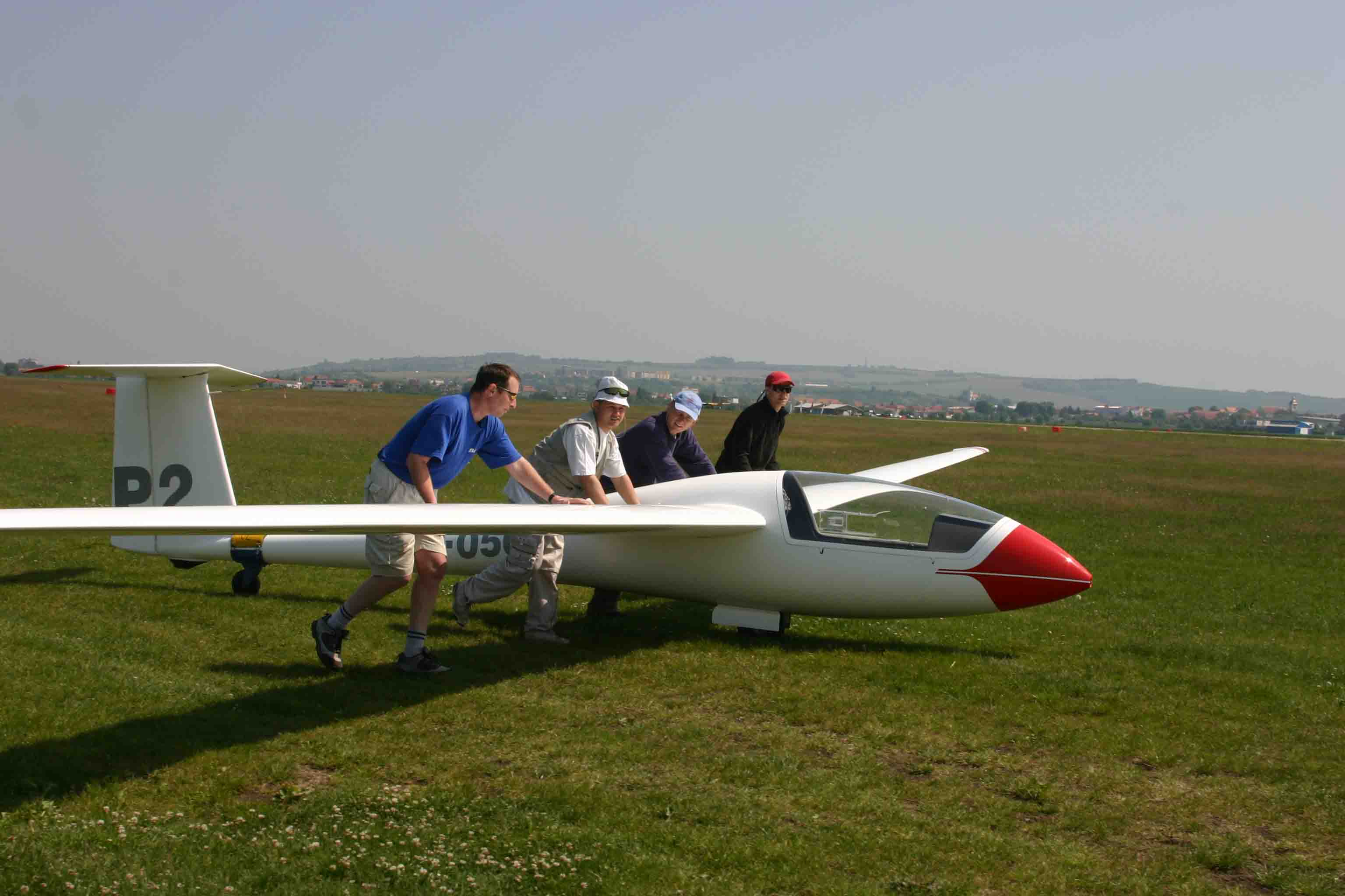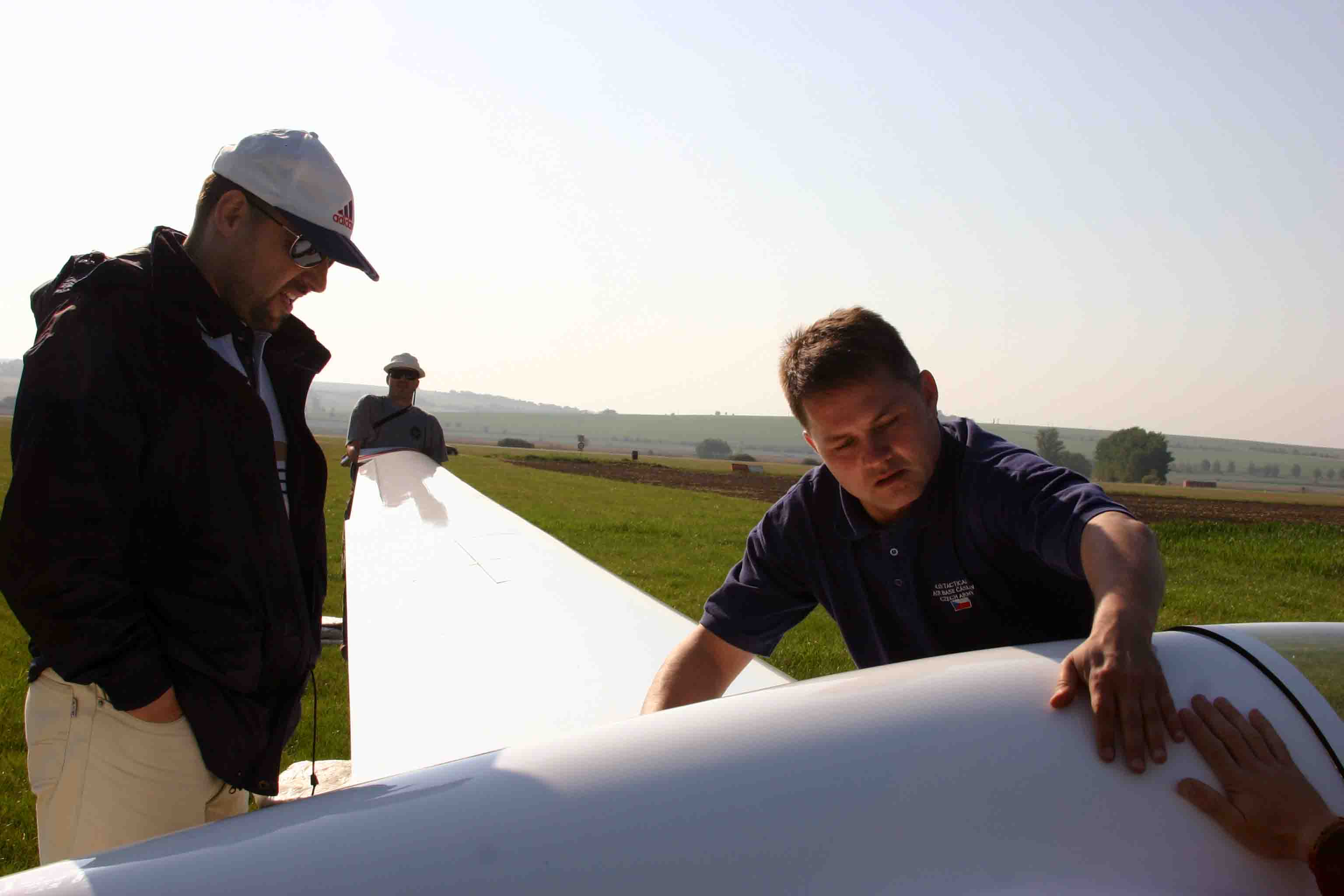 Příprava na první let kluzáku začala v brzkém ránu. Pilot Josef Sedláček je nalevo.