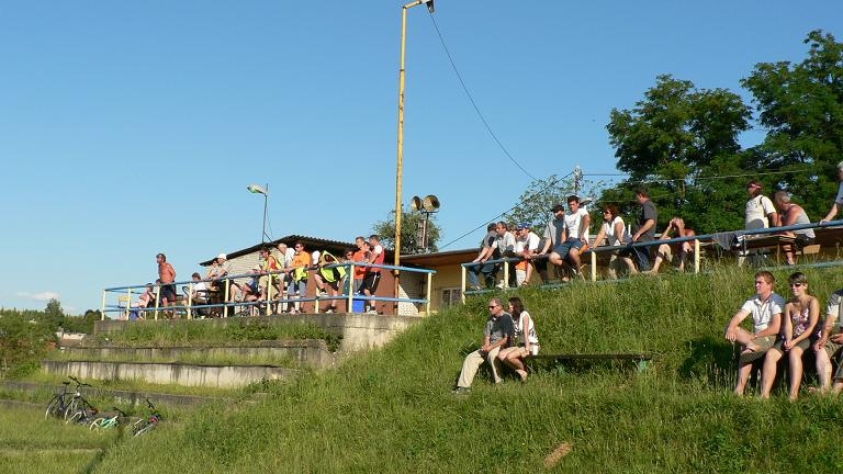Pohled na tribuny v Jalubí. Možná by to chtělo posekat trávu. "Nejhorší hřiště a zázemí v I.B třídě," řekl po zápase stoper Petr Ratajský