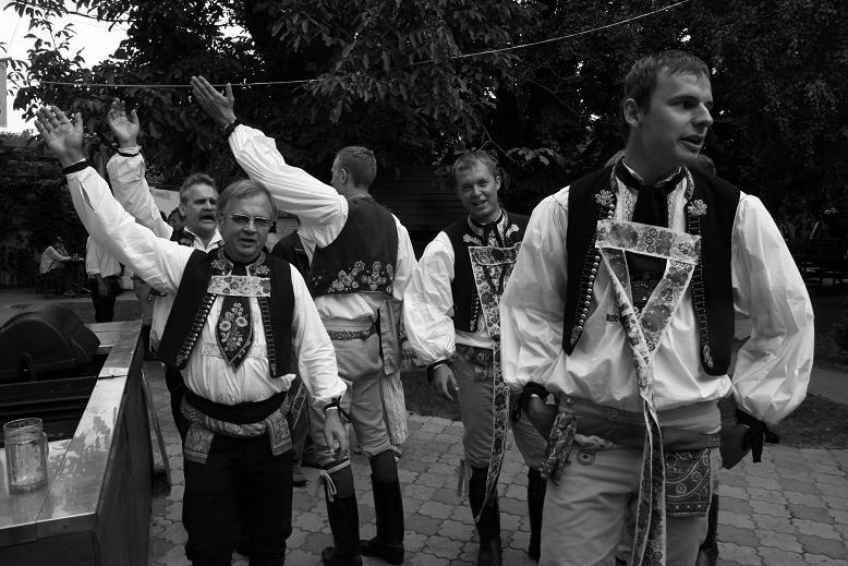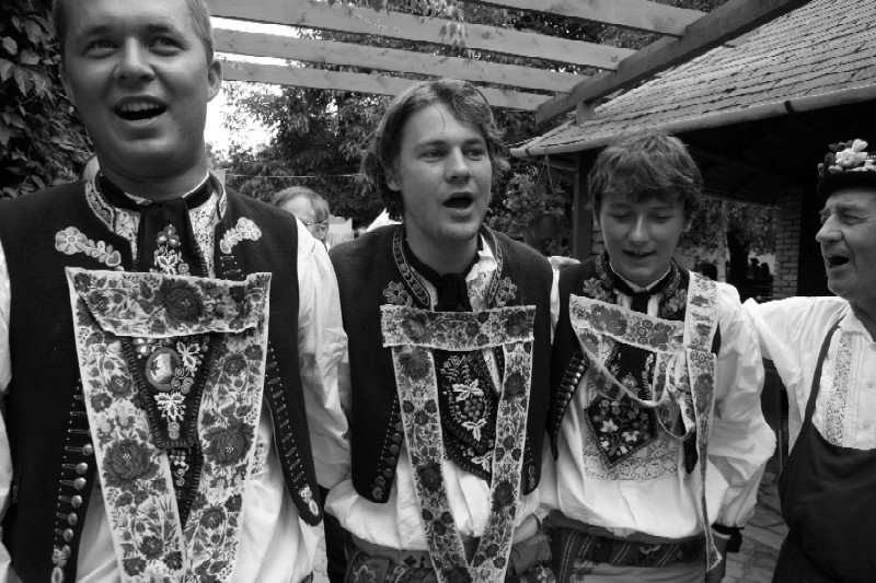 Dvacet mužů na dvaceti koních. Pyšných, šťastných, dojatých. Nikomu z nich se z náměstí nechce. "A já mám koníčka vraného, na čtyry noženky kutého, on mě pěkně vozí, po studenéj rosí..." zpívají a někteří se odvážně staví na sedlo. Je čas pobídnout koně k odchodu. Ještě jedna písnička: "Horé dědinů, chlapcí chodijů, a oní idů k nám..." A ještě další. "Cos porobil, Pavelenko, Pavle, Pavelenko, Pavle, že ťa vézů svázaného v kozle, svázaného v kozle..."