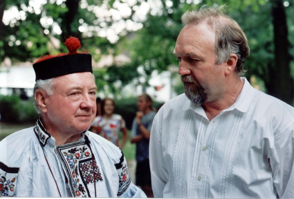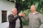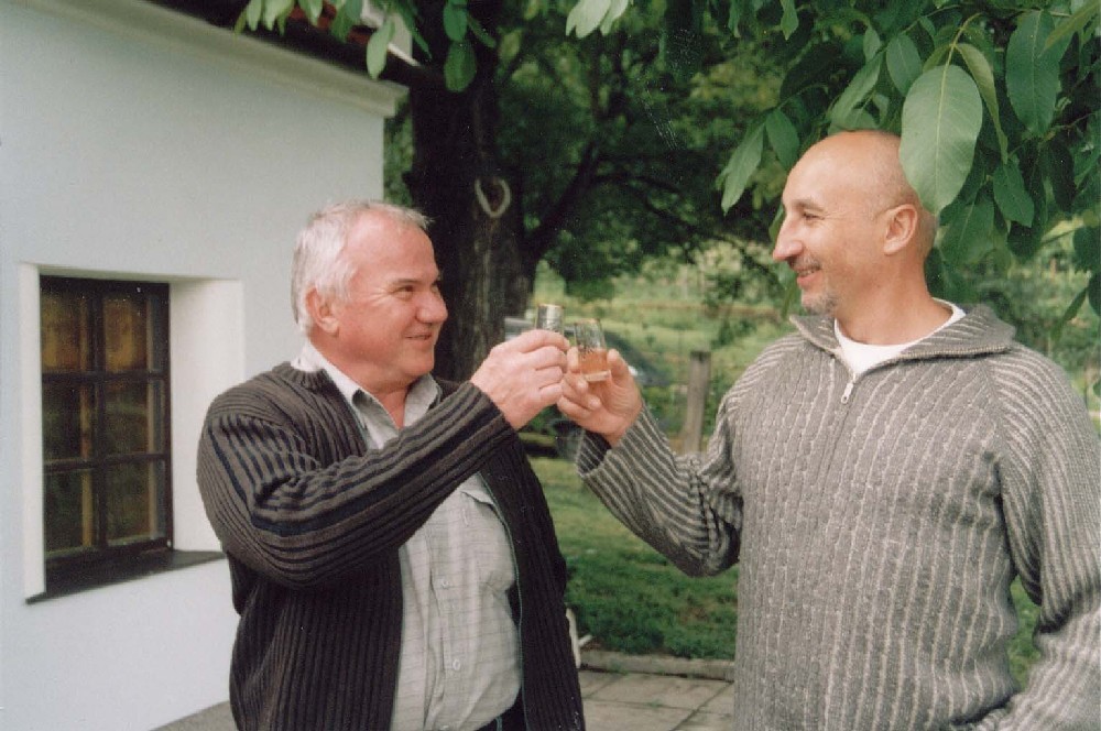 ..To je můj malý příspěvek do galerie vinařů. Šohaji, pravda už trochu v letech, ale nic jim to nebere chuti do života - Vlčnovjani , pěvci folkloristi. Jinak, především - velmi dobří přátelé. Ten co leje, je pan Leman, ten co drží skleničku je pan Králíček. Ten má za sebou velmi těžký život a přes to je vždy plný pohody a s úsměvem. Pan Leman bydlí v Uherském Brodě, ale ve Vlčnově má své kořeny a taky bůdu a vinohrad.