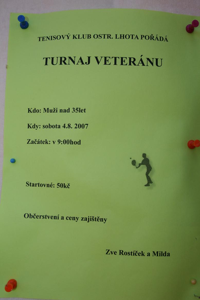 V sobotu 4.8.07 se konal v Ostrožské Lhotě tradiční turnaj tenisových veteránů. Turnaje se zúčastnilo osm zkušených tenisových harcovníků, kteří byli rozlosováni do dvou skupin. Každá skupina měla svého nasazeného favorita podle výkonnosti a zkušeností. Byli to v „A“ skupině Milan Štěpán a v „B“ skupině Vlasta Radoch.