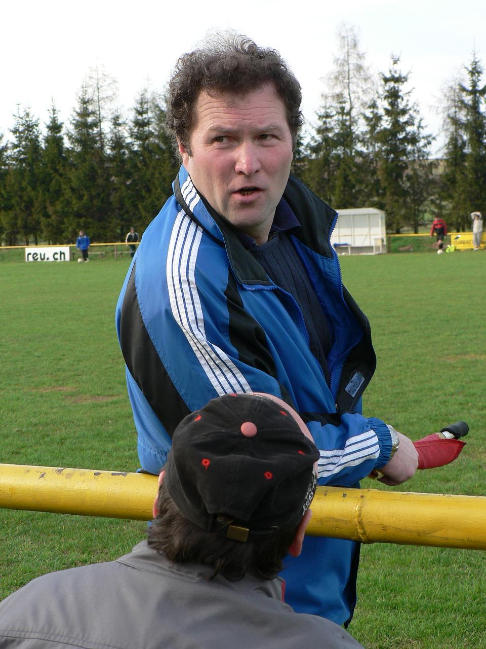 Trenér Lhoty Josef Dominik o poločase probírá utkání s domácími funkcionáři.