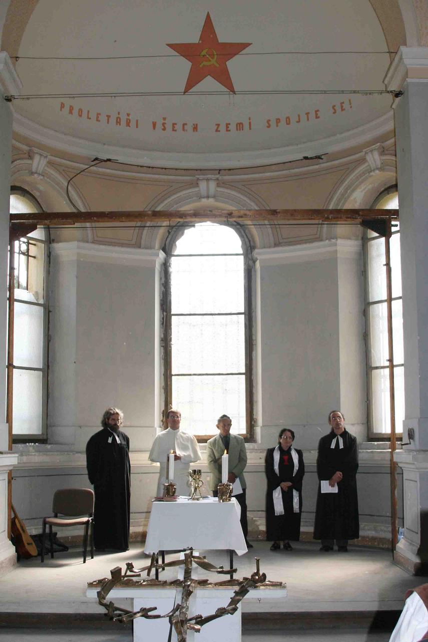 Rozbitá okna, oprýskané stěny, seškrábané fresky a nápis "Proletáři všech zemí spojte se" s rudou hvězdou, srpen a kladivem, tak vypadá kaple neblaze proslulé uherskohradišťské věznice. Právě tady se uskutečnila ekumenická bohoslužba na uctění památky politických vězňů fašistického i komunistického režimu.