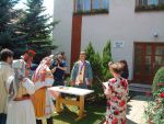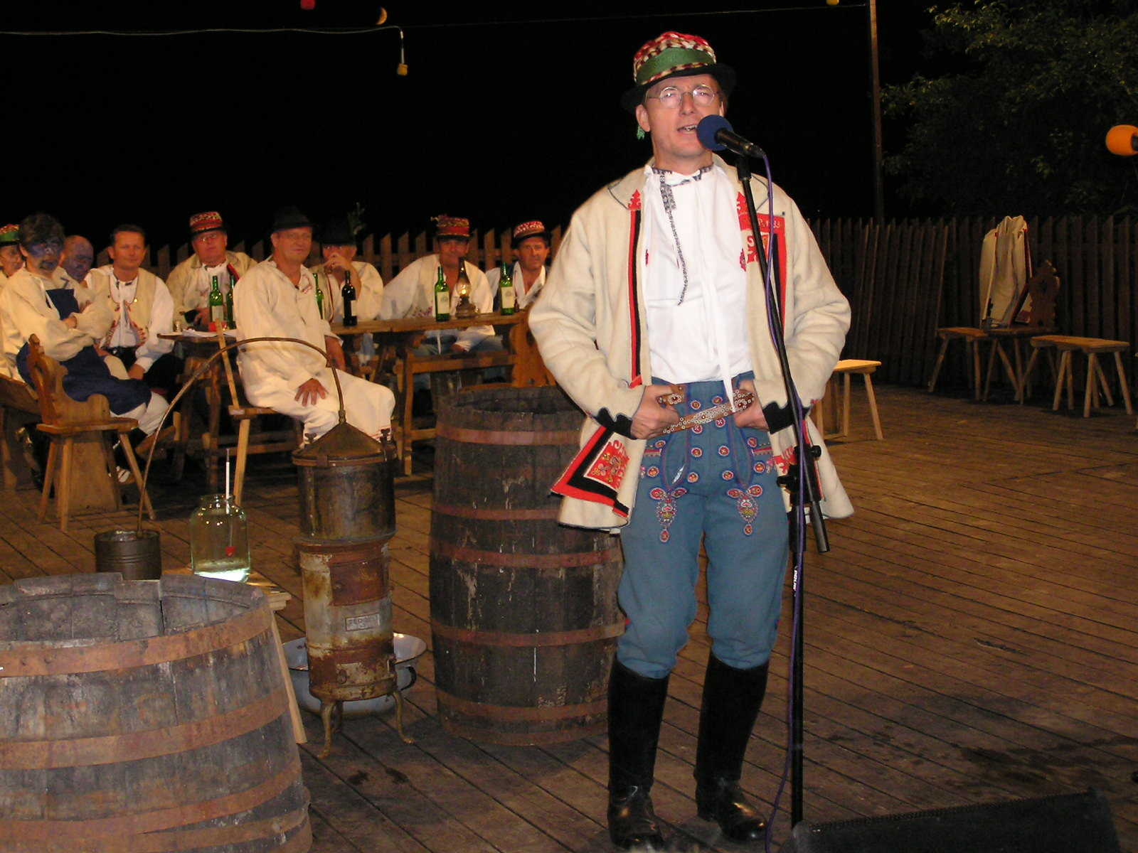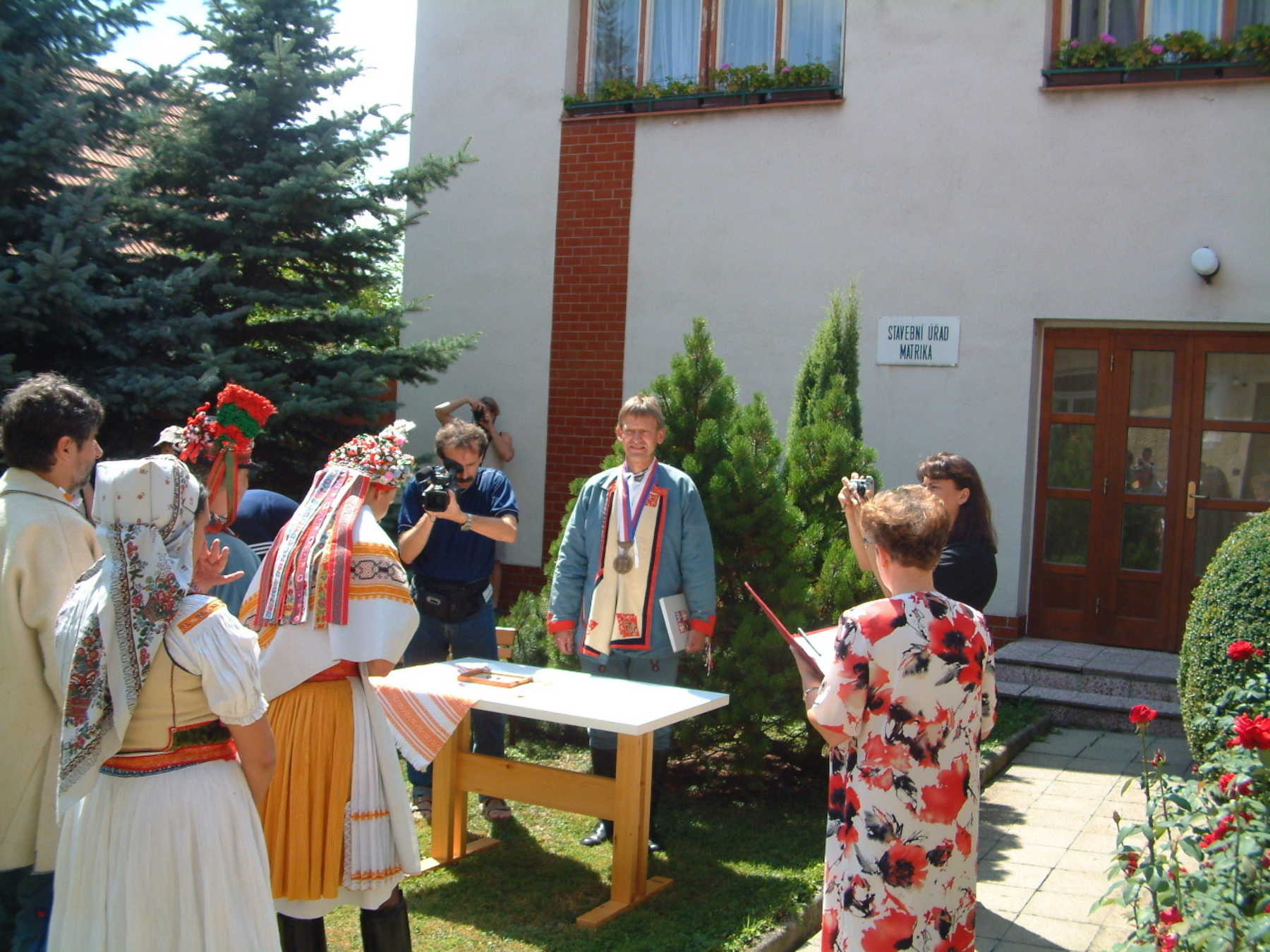 Velický starosta Jiří Pšurný se rád obléká do lidového kroje. Na snímku je zachycen z roku 2003, kdy u příležitosti konání Horňáckých slavností oficiálně sezdával v zahradě obecního úřadu mladé novomanžele z Prahy.