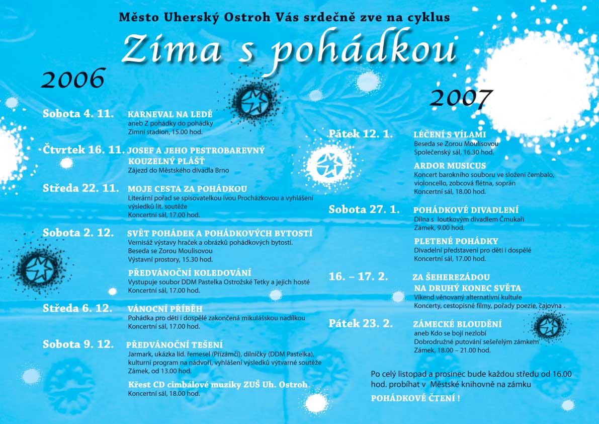 Po loňském úspěchu čtyřměsíčního cyklu Zima s anděly, připravil letos odbor kultury Uherského Ostrohu cyklus Zima s pohádkou. Program bude skutečně zajímavý, žánrově pestrý a vyberou si z něj určitě děti i dospělí.